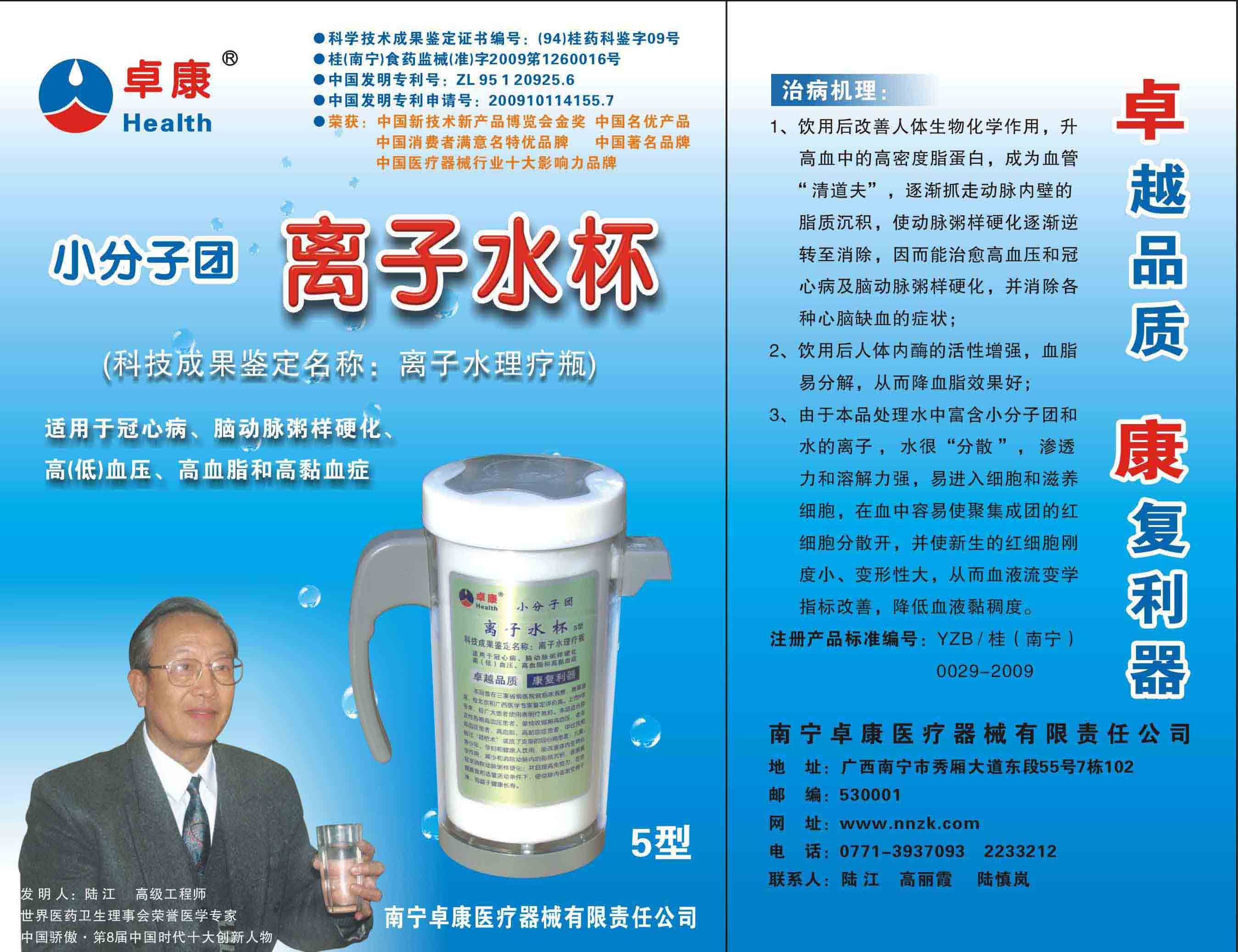 -----我是從事建筑的高工,本來沒有資格去攻克醫(yī)學(xué)難題,卻為了自身健康才扣響醫(yī)學(xué)的大門。由于我1990年患高血壓,因怕中風(fēng)才研究發(fā)明了離子水瓶,我把水處理成微小分子團水,飲用后治愈了高血壓。便于1993年底送到三家省級醫(yī)院做臨床試用4個月。經(jīng)北京和廣西醫(yī)學(xué)專家鑒定:"降脂降壓效果好"," 能擴大心腦動脈流量,改善心腦電圖以及微循環(huán)","對治療心腦動脈粥樣硬化、高血壓、高血脂有良好的醫(yī)療保健作用。""產(chǎn)品的技術(shù)性能和療效達(dá)到了同類產(chǎn)品的國內(nèi)領(lǐng)先水平,經(jīng)廣西醫(yī)學(xué)科學(xué)情報研究所檢索,未見國外有類似報道。"中國醫(yī)學(xué)科學(xué)院張正國教授從美國國立醫(yī)學(xué)圖書館數(shù)據(jù)庫存Medline檢索英俄文資料,均未見類似報告。2000年上市后,我為了對消費者負(fù)責(zé)而繼續(xù)觀察研究,一直通過《信譽卡》和《質(zhì)量跟蹤調(diào)查書》向患者承諾療效,請用戶使用6個月后反饋效果。和脂壓患者飲用2至5個月內(nèi),消除癥狀,停服藥物,血壓正常;冠心病患者飲用3~5個月逐漸減輕至消除心絞痛、房顫等癥狀,不再服藥,飲用1年左右心電圖正常,經(jīng)冠脈造影掃描無明顯狹窄,表明冠心病痊愈。大量患者還反映許多衰弱器官被修復(fù),讓前列腺增生、慢性咽喉炎、慢性氣管炎、支氣管炎、慢性胃炎、腸炎和膽囊炎等不藥而愈;2型糖尿病患者是因為胰島衰弱致病,飲用該水半年至一年,逐漸減藥至停藥,血糖尿糖正常,真正治愈2型糖尿病。中風(fēng)后遺癥患者飲用六七個月,可逐漸減輕至消除肢體和語言障礙,表明飲用該水能讓壽命很長的神經(jīng)元細(xì)胞逐漸修復(fù),奇跡般地恢復(fù)肢體和語言功能。飲用后還使胸腺和脾臟兩個重要的免疫器官被修復(fù)和增強,產(chǎn)生免疫細(xì)胞多,提高了免疫力,使人不生病或少生病。自此, 飲用微小分子團水創(chuàng)造了攻克冠心病、高(低)血壓和糖尿病三大醫(yī)學(xué)難題的奇跡。人們對此感到不可思議,但實踐是檢驗真理的唯一標(biāo)準(zhǔn)。